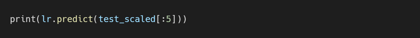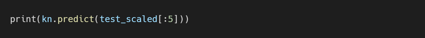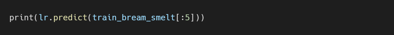 훈련한 모델을 사용해 train_bream_smelt에 있는 처음 5개 샘플을 예측해보자