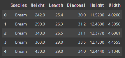 입력 데이터 : Weight, Length, Diagonal, Height, Width 열