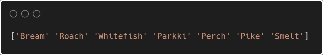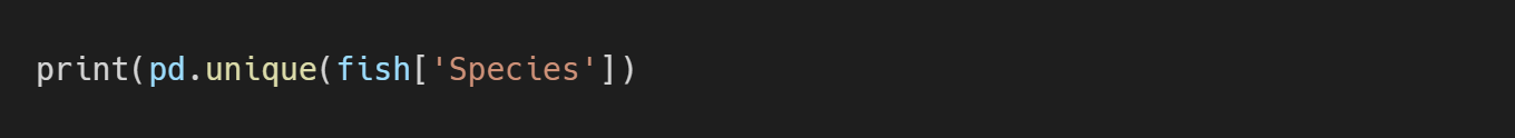 어떤 종류의 생선이 있는지 알아보기 위해 Species 열에서 고유한 값을 추출해보기 위해 pandas의 unique()함수를 사용한다.