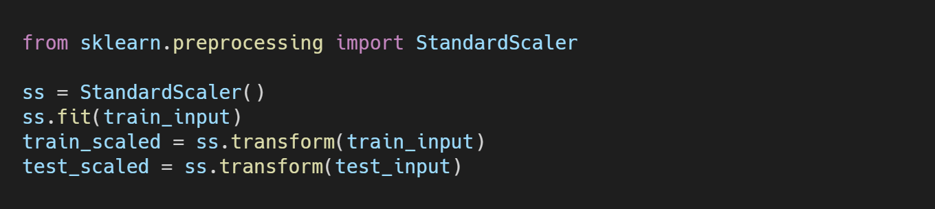 StandardScaler 클래스를 사용해서 훈련세트와 테스트세트를 표준화 전처리한다.