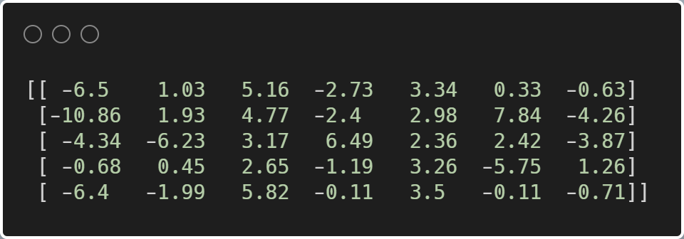 이 데이터는 5개의 특성을 사용하므로 coef_배열의 열은 5개인데, 행이 7개이다. intercept_도 7개나 있는 것을 보아 이는 이진 분류에서 봤던 z를 7개나 계산한다는 의미이다.