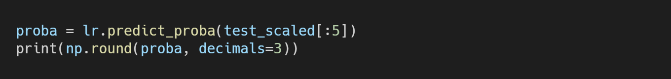 샘플마다 2개의 확률이 출력되어 첫 번째 열이 음성 클래스(0)에 대한 확률이고 두 번째 열이 양성 클래스(1)에 대한 확률이다.