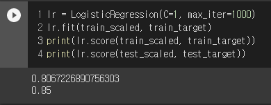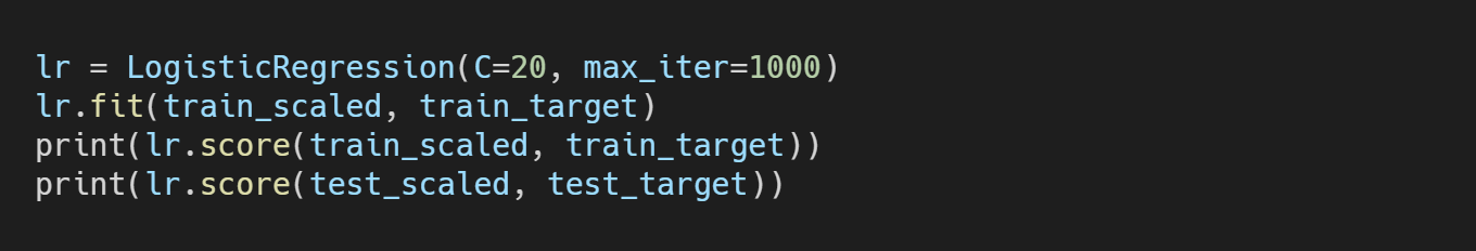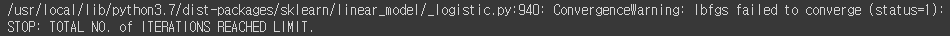 LogisticRegression 클래스는 기본적으로 반복적인 알고리즘을 사용한다. max_iter 매개변수에서 반복횟수를 지정하며 기본값은 100인데 반복횟수가 부족하다는 경고가 발생해서 반복횟수를 1000으로 늘렸다.