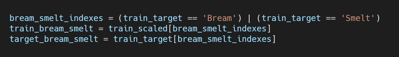 도미와 빙어에 대한 결과를 비트 OR 연산자(|)를 사용해 합치면 도미와 빙어에 대한 행만 골라낼 수 있다.