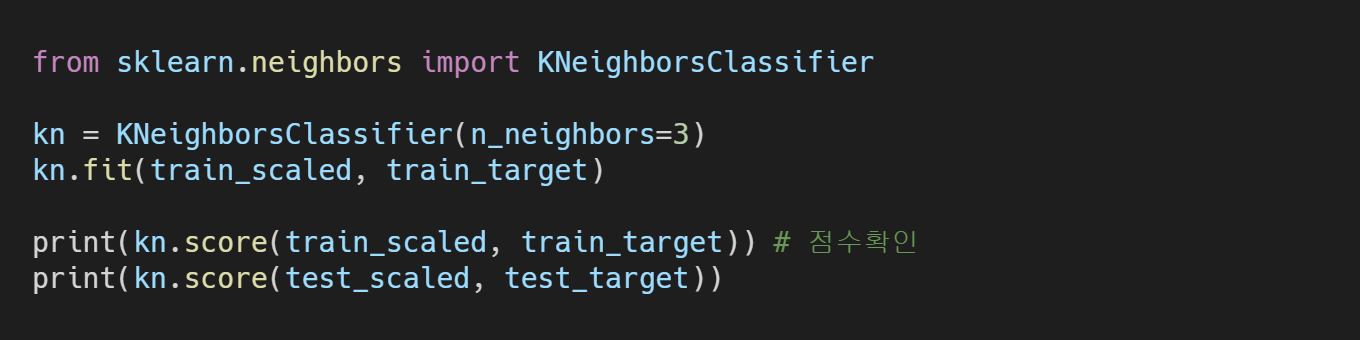KNeighborsClassifier 클래스 객체를 만들고 훈련세트로 모델을 훈련한다.
