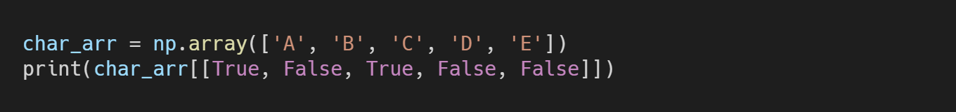 'A'에서 'E'까지 5개의 원소로 이루어진 배열에서 'A'와 'C'만 골라내려면 첫 번째와 세 번째 원소만 True이고 나머지 원소는 False인 배열로 전달하면 된다.