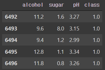총 6497개의 샘플이 있고 4개의 열은 모두 실수값(float)임을 알 수 있다.
