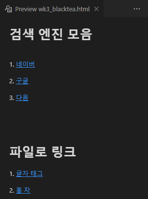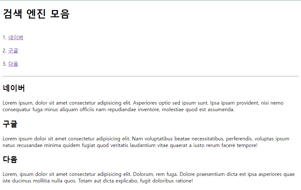 네이버를 클릭하면 '네이버'의 내용이 있는 곳으로 이동한다. 여기에서 p태그 안에 있는 내용이 적어서 이동한지 잘 안보이는데 내용을 늘리면 링크 이동이 되었음이 잘 보일 것이다