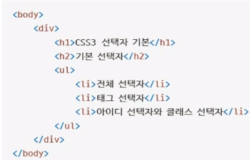 - 선택자 : CSS3에서 특정 HTML 태그를 선택할 때 사용