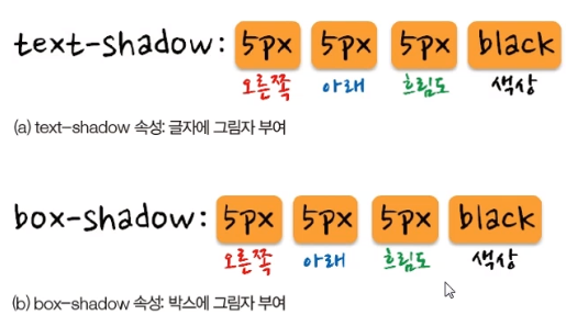 text-shadow: 5px 5px 5px black; /*오른쪽, 아래쪽, 흐림정도, 색깔*/