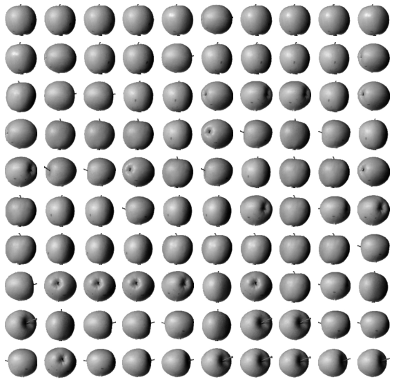 axs[i, j].imshow(fruits[apple_index[i*10 + j]], cmap='gray_r')