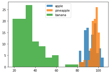 사과, 파인애플, 바나나에 대한 히스토그램을 그려서 평균값이 어떻게 분포되어 있는지 확인해본다