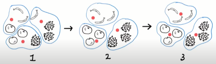 - 클러스터 중심에 변화가 없을 때까지 2번으로 돌아가 반복한다.