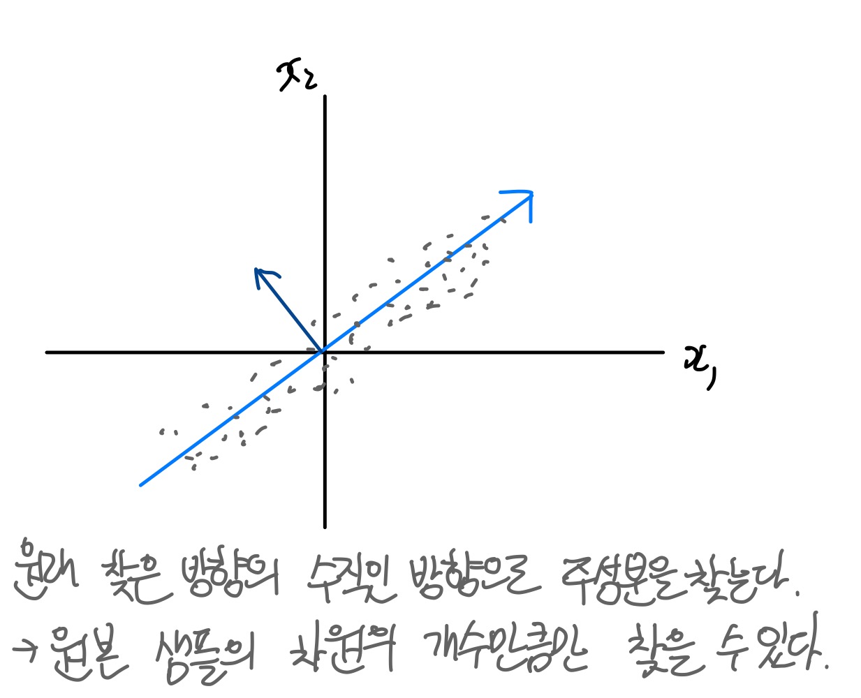- 데이터에 있는 분산이 큰 방향을 찾는 것