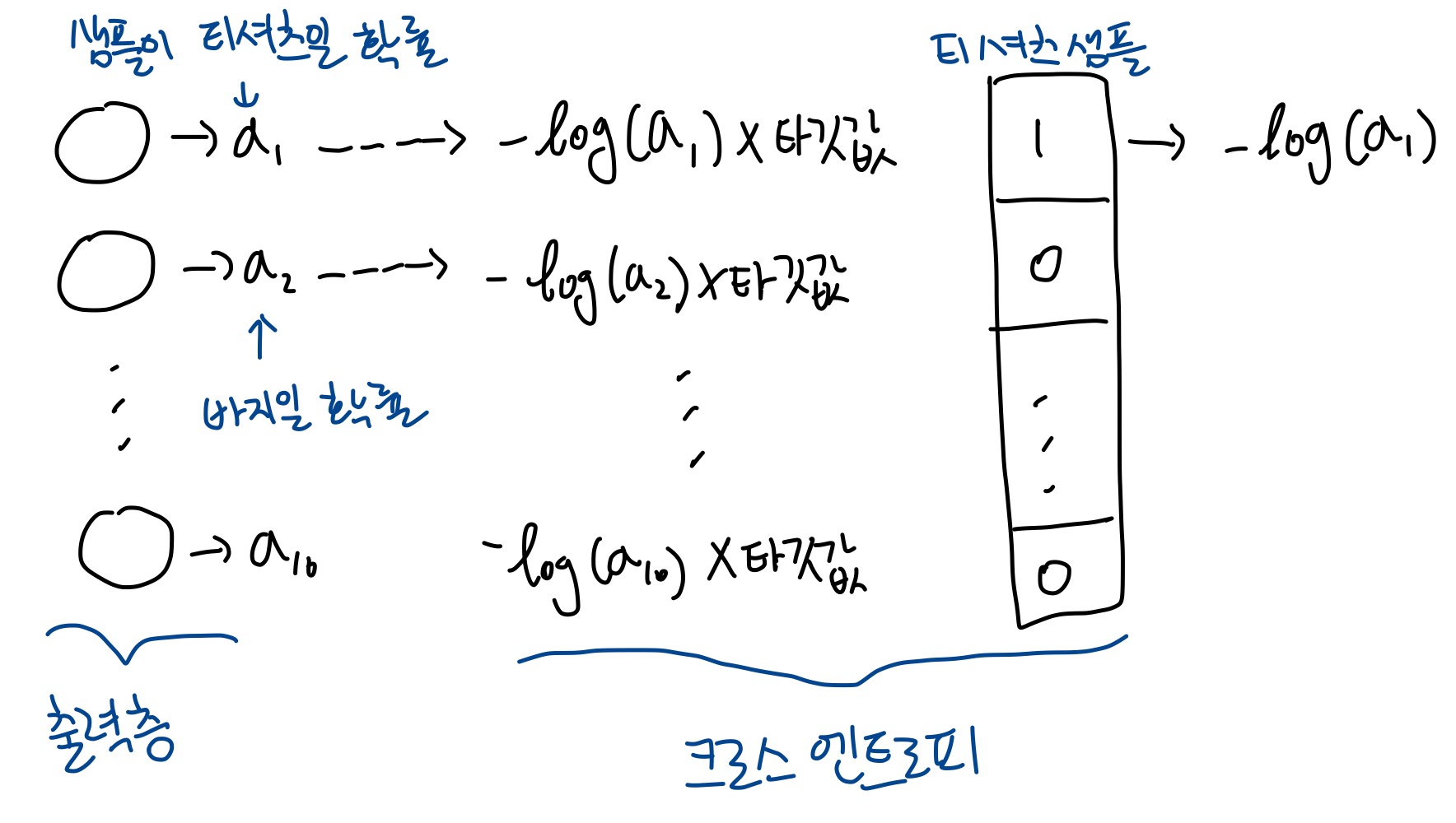 크로스 엔트로피 공식에서 이 확률에 log를 취해서 타깃값과 곱해진다. 티셔츠만 1이고 나머지는 0인 원-핫 인코딩이 되어야 나머지 유닛에서의 출력값이 0으로 곱해져서 상쇄된다. 타깃에 해당되는 뉴런의 출력값만 살아남아서 손실에 반영된다.