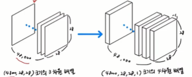 28x28의 2차원 배열이지만 끝에 한 차원을 두어서 28x28x1의 3차원 배열로 변경한다.