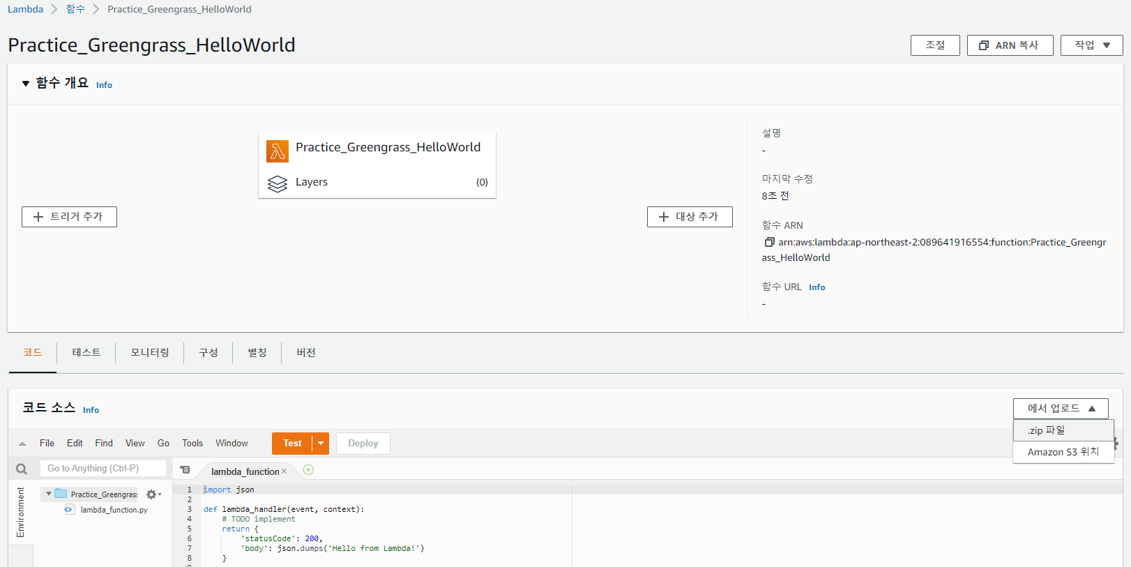 이테스트의 도구 모음에서AWS Lambda콘솔이 이 함수에서 작동하지 않습니다. 이AWS IoT Greengrass코어 SDK에는 Greengrass Lambda 함수를 독립적으로 실행하는 데 필요한 모듈이 포함되어 있지 않습니다.AWS L