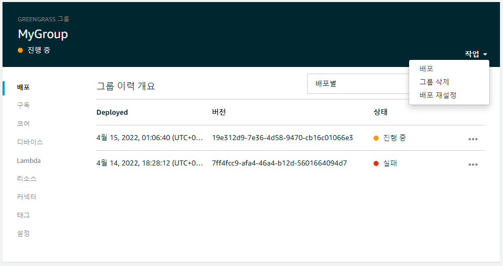 작업(Actions)에서 배포(Deploy) 클릭하면 위와 같이 배포가 시작된다