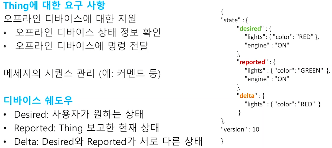 디바이스 섀도우 : 디바이스가 오프라인이 되어있다고 하더라도 최종적으로 reporting한 status 정보들을 클라우드가 가지고 있는데 그 정보들만 조회하면 된다. 디바이스의 정보를 조회하기 위해서 디바이스까지 갈 필요 없이 클라우드만 한 번 갔다오면 디바이스 정보를 확인할 수 있다.