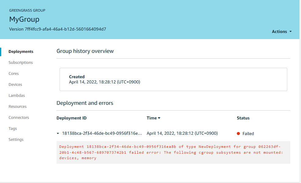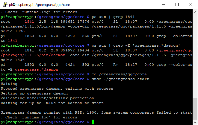 코어 디바이스가 인터넷에 연결되어 있는지 확인하고, 위 문장으로 코어 디바이스에서 Greengrass 데몬이 실행 중인지 확인한다.