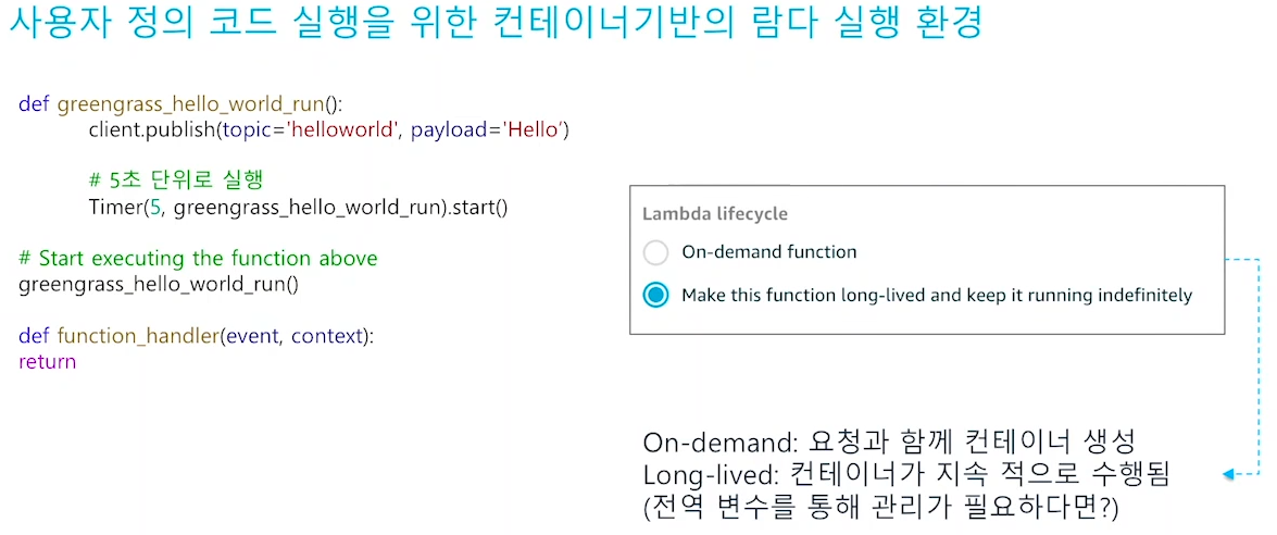 Make this function long-lived and keep it running indefinitely의 경우 컨테이너 하나가 계속적으로 메시지를 처리한다. 핸들러에 아무것도 없지만, greengrass hello world라는 특정 토픽에 메시지를 쏘기만 한다. thing들과 통신하거나 그린그래스 자체에서 데이터를 수집할 때에 있어 파일 시스템의 데이터를 10분 단위로 조회해서 s3에 올릴 때 쓰면 된다. 핸들러와 관계 없고, 컨테이너가 계속 올라와 있으면서 10분 단위로 파일 시스템을 읽어서 업로드하는 코드이다.