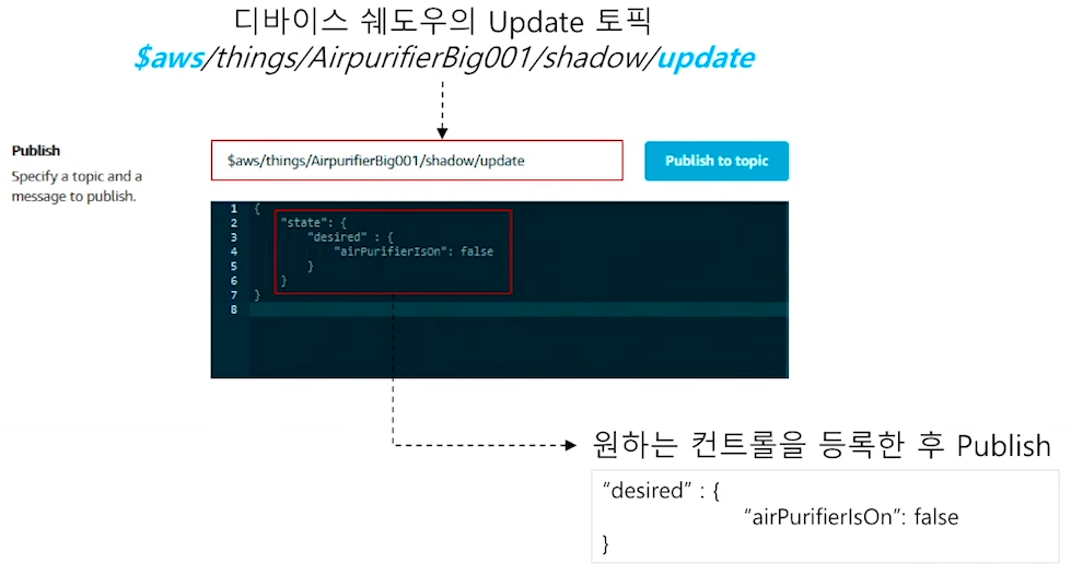 디바이스 섀도우의 업데이트 토픽에 '공기청정기를 종료시키라고 선언'해 두었을 때 내가 원하는 desired 상태가 공기청정기를 끄는 상태이고, 만약 디바이스에서 올라온 데이터가 공기청정기가 켜져있다고하면 공기청정기를 종료하라고 delta 메시지가 발생할 것이고, 그것들을 구현하면 된다(?)