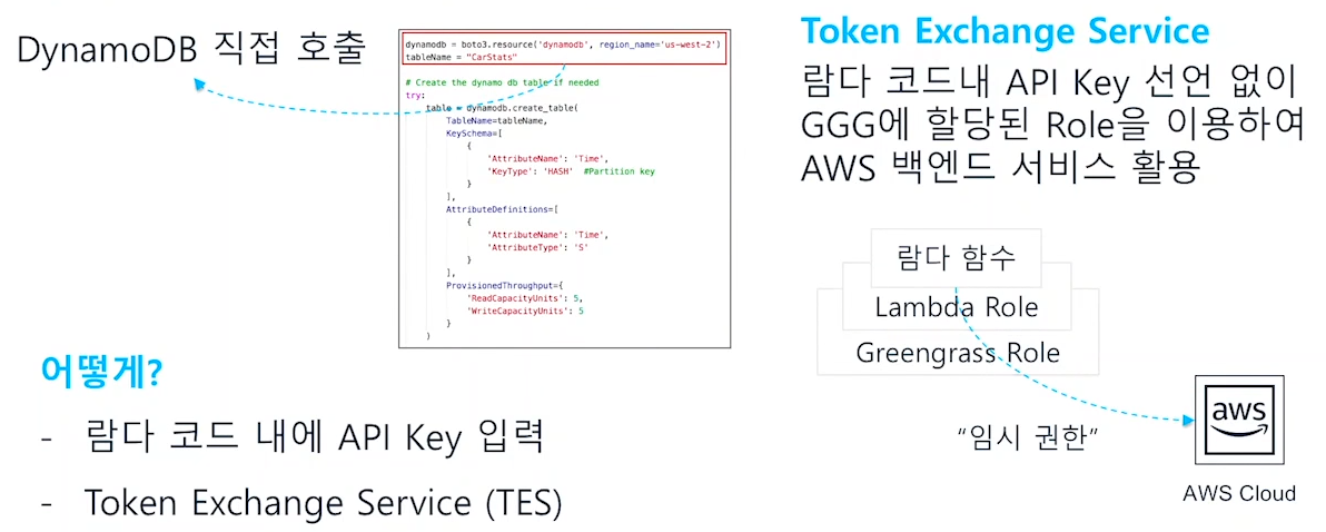 TES(Token Exchange Service) : 그린그래스 자체에 role을 할당하고 그 롤을 기반으로 실제 aws의 백엔드 서비스와 커뮤니케이션 할 수 있다. 람다 코드 내에서 aws 백엔드 서비스와 원할하게 통신할 수 있으며, 람다 코드에 api key와 같은 정보를 넣을 필요가 없다.