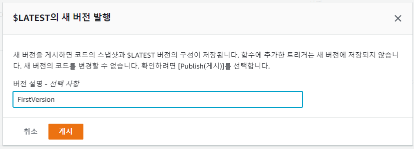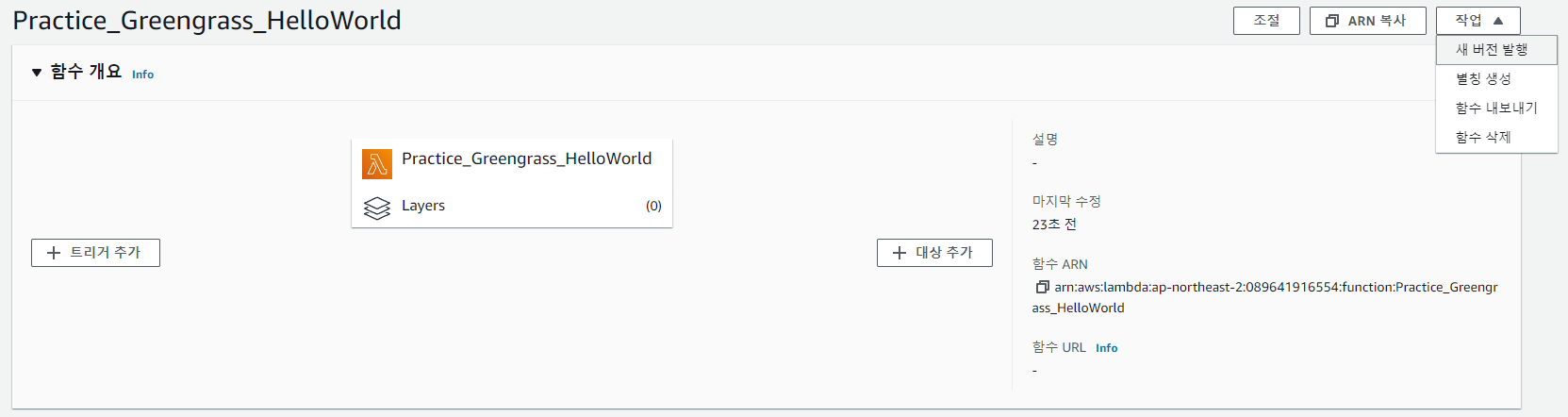 람다 함수를 게시한다. 작업(Actions)에서 새 버전 발행(Publish new version)을 클릭한다.