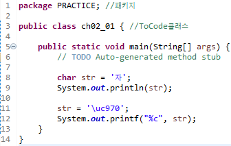 6. 문자를 저장할 변수를 선언해 '자' 저장-> 출력 -> 같은 변수에 '\ua790'을 저장한 후 출력
