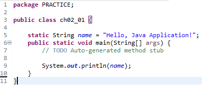 1. 필드에 정적인 name: 자료형 String: 초기값: "Hello Java Application!"