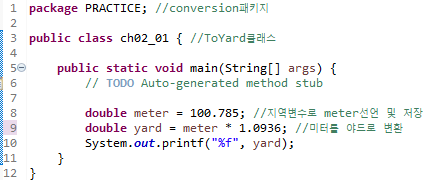 4. 지역변수로 meter를 double로 선언하여 100.785 저장