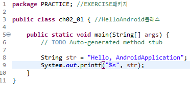 3. 지역변수로 문자열을 저장할 str 선언 후, 초기 값으로 "Hello, Android Application!" 저장, 출력