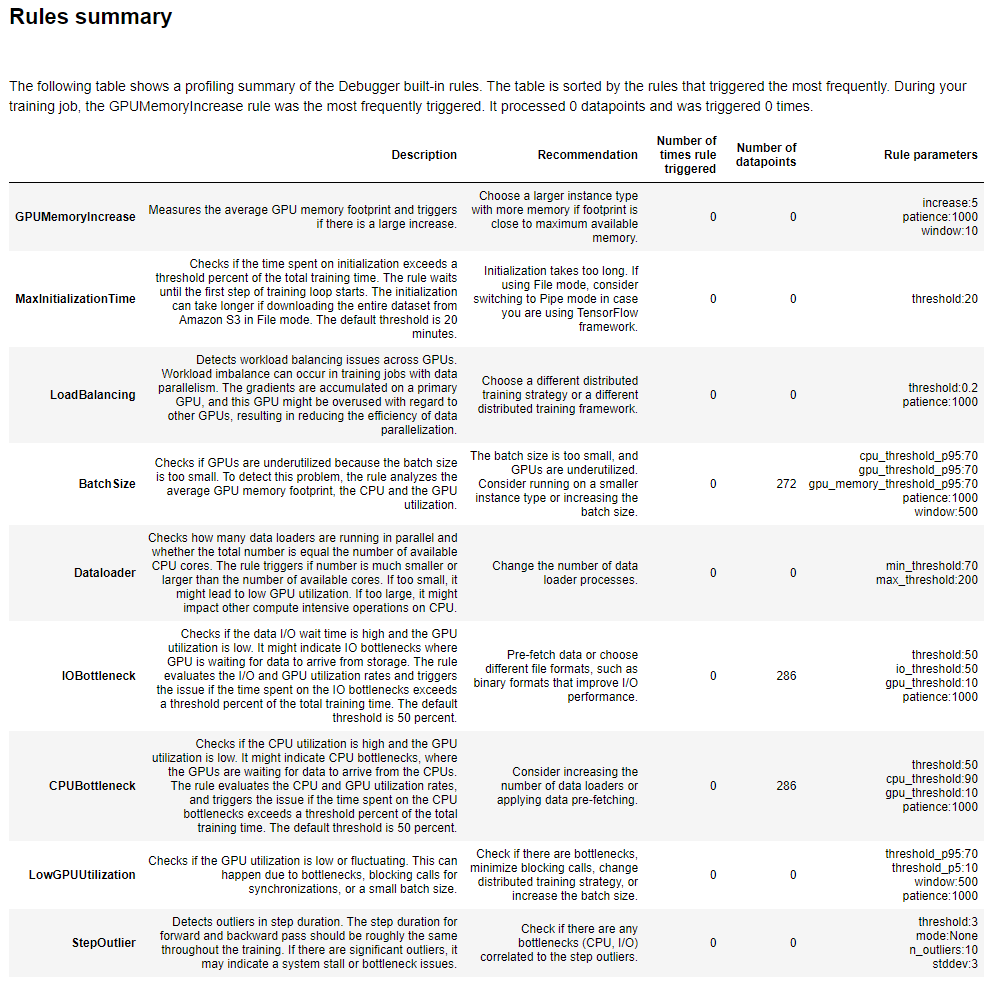 EC2 인스턴스 리소스 사용률, 시스템 병목 현상 감지 결과, 파이썬 작업 프로파일링 결과에 대한 요약 및 세부 정보를 보여주는 디버거 프로파일링 보고서의 파일링크가 반환된다