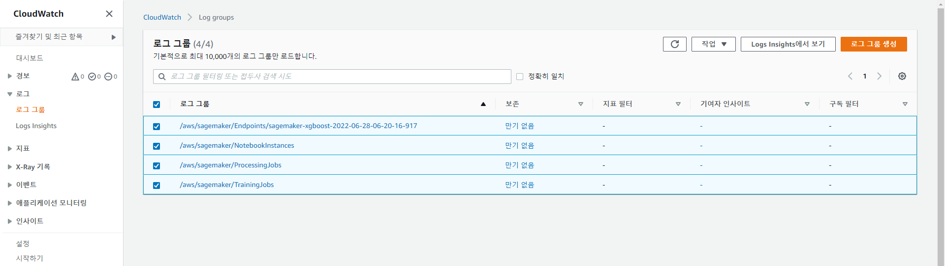 /aws/sagemaker/라고 시작하는 그룹을 모두 삭제하면 된다. 작업-로그그룹 삭제 클릭