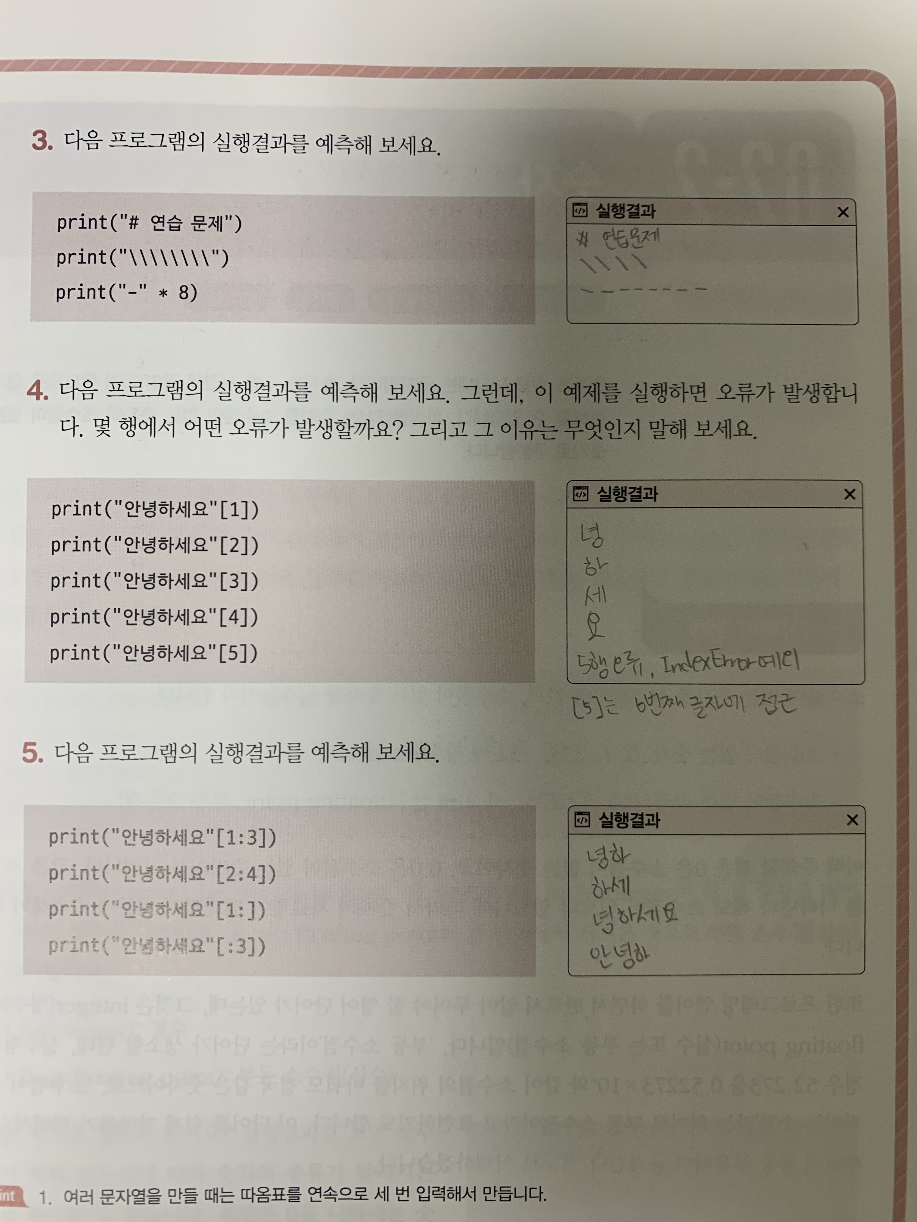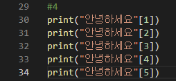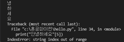 풀이) 파이썬은 인덱싱할 때 0부터 시작한다. 여기에서 '안'이 0번째이니, 5번째는 없는 글자이다. 없는 글자를 출력하라고 했으니 IndexError...gg