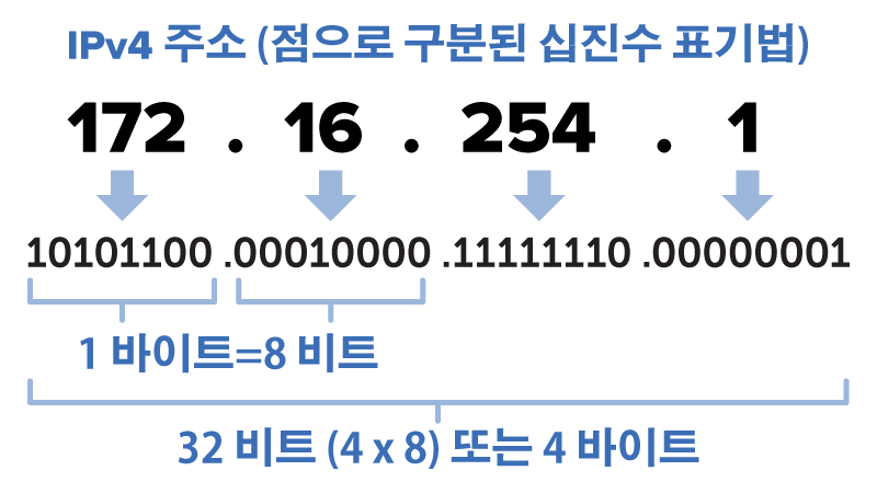 IP주소의 4개 숫자 합계는 이진 형식의 32비트 = IPv4