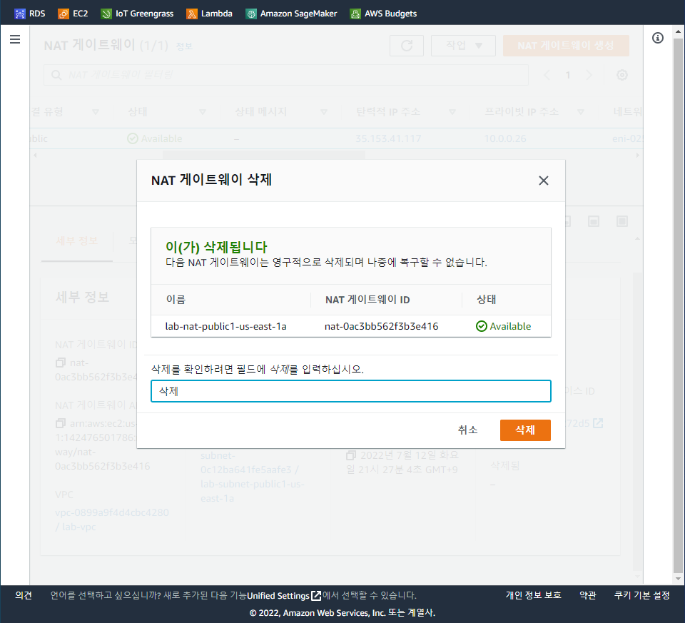 삭제할 게이트웨이 선택 - 작업 - NAT 게이트웨이 삭제 하면 이런 창이 뜨는데 삭제를 입력하고 삭제하면 된다!