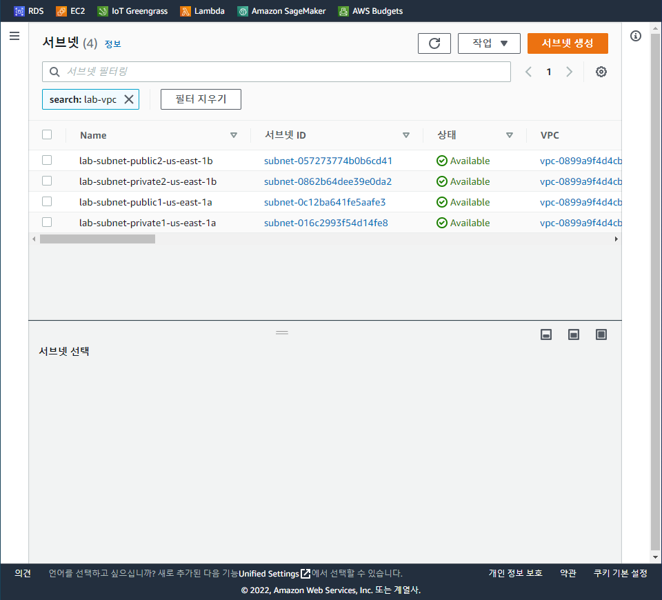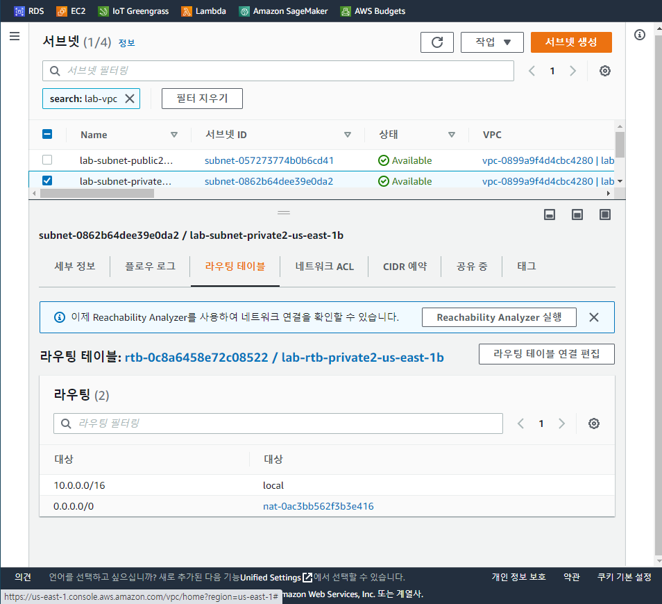 프라이빗 서브넷과 퍼블릭 서브넷이 각각 2개씩 만들어진 것을 확인할 수 있다