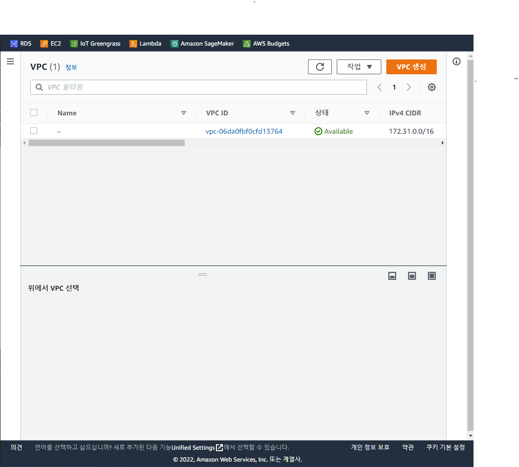 VPC 페이지에서 VPC로 들어가면 된다. 그럼 이렇게 기본적으로 생성된 VPC가 있음을 볼 수 있음 디폴트!