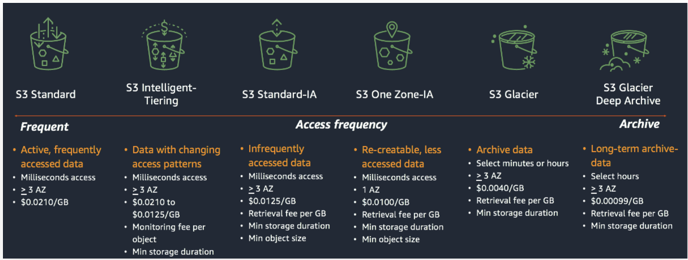 액세스 빈도가 낮지만 필요할 때 빠르게 액세스 해야하는 데이터 단일 가용 영역에 데이터를 저장 Standard-Infrequent Access보다 비용 저렴 가용성과 복원력이 필요없는 경우 사용 ex) 보조 백업 사본 저장, 이미지 카탈로그 썸네일 버전과 같은 쉽게 재생성할 수 있는 데이터 |