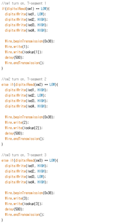 - 스위치 3번을 누르면 3번 LED만 ON이 되고 나머지는 Off, 3번 7-segment에 3로 표시