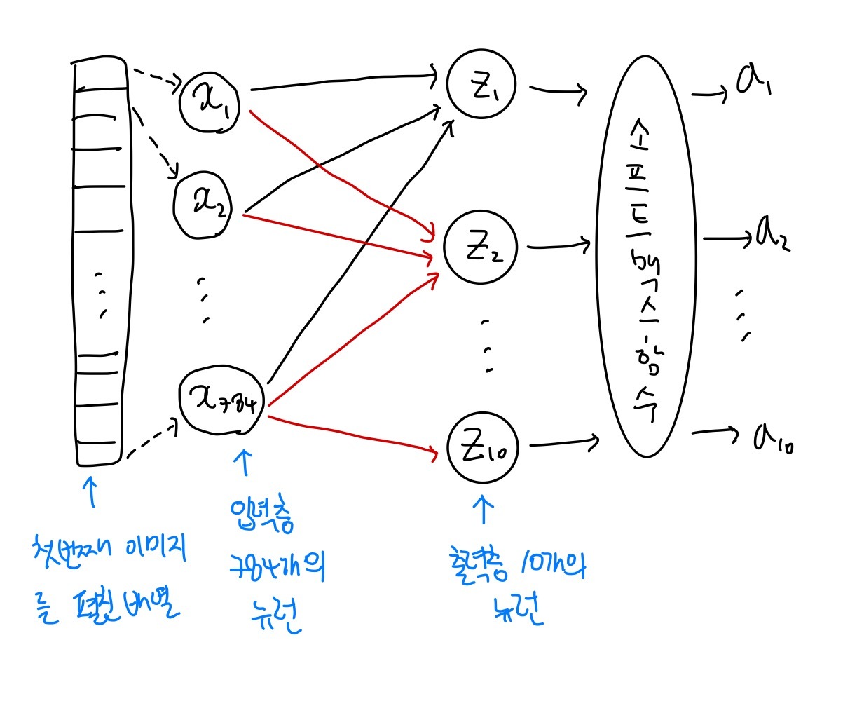 그림처럼 왼쪽의 784개의 픽셀과 10개의 뉴런이 모두 연결시켜보면 784x10=7840개의 연결된 선을 볼 수 있다
