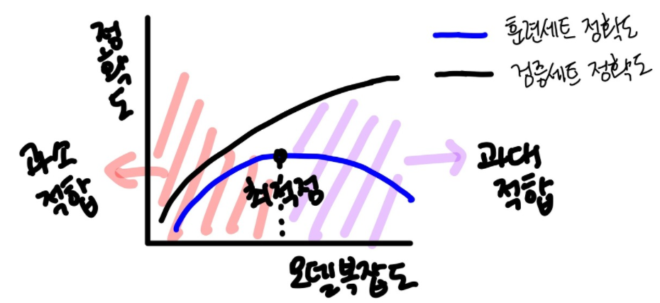 그래서 과소적합과 과대적합을 막기 위해 우리는 모델의 최적점을 찾아야한다!