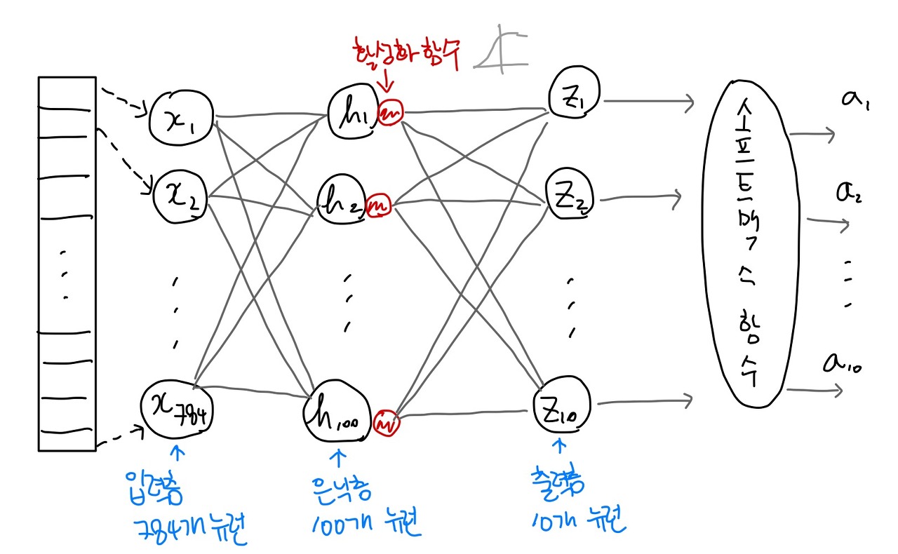 입력층에 784개의 뉴런(픽셀 하나인 x를 의미)이 있고, 은닉층에는 100개의 뉴런이 있다. 가충치의 개수가 784x100개 이고 100개의 뉴런은 100개의 절편이 있다. 이를 다 더하면 78500개가 나온다.