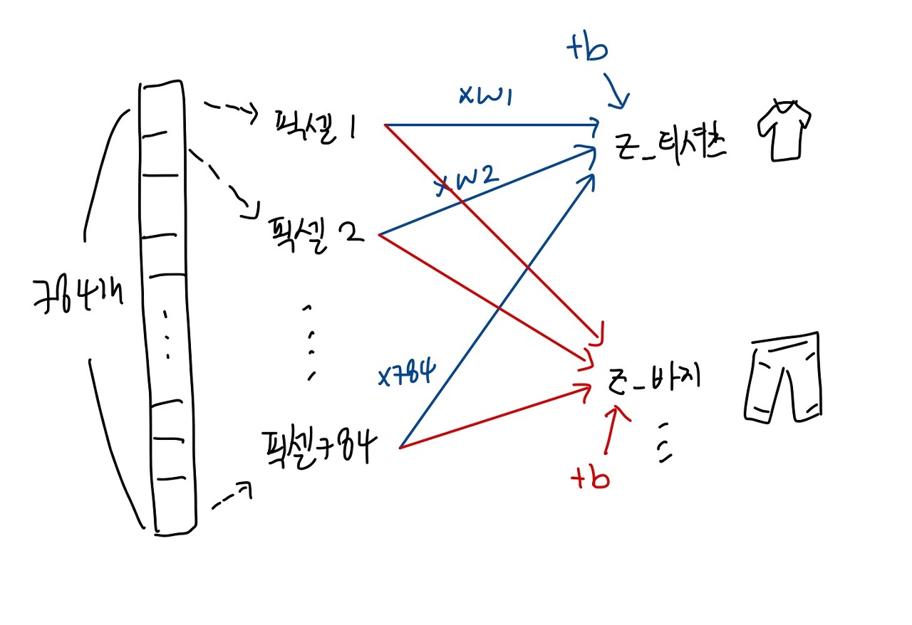 z_티셔츠 = w1 x (픽셀1) + w2 x (픽셀2) + ... + w784 x (픽셀784) + b