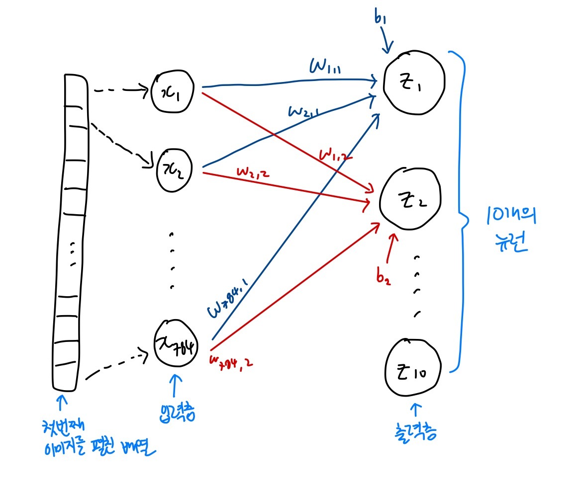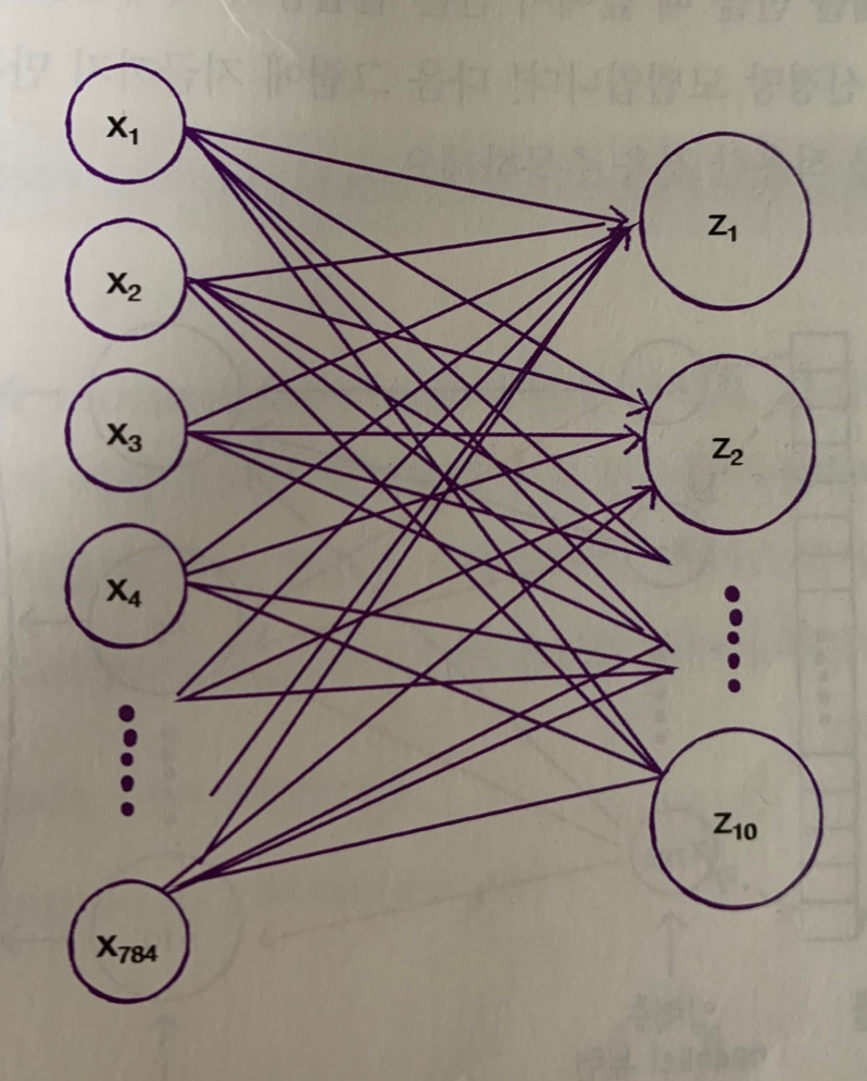 그림처럼 왼쪽의 784개의 픽셀과 10개의 뉴런이 모두 연결시켜보면 784x10=7840개의 연결된 선을 볼 수 있다