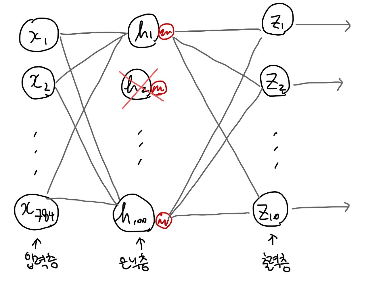 100개의 은닉층의 뉴런중 30개가 계산이 안되도록 드롭아웃시켰다