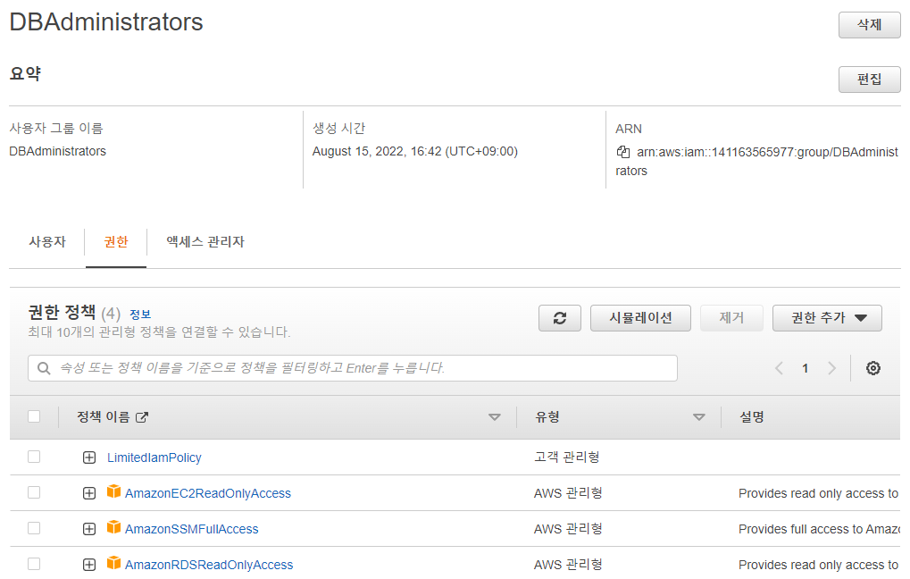 40. DBAdministrators 그룹에서 정책을 수정한다