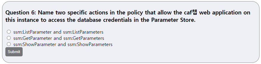 올리비아는 이제 EC2 인스턴스가 파라미터 스토어에 액세스 가능한 웹 애플리케이션임을 확신했다