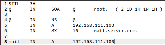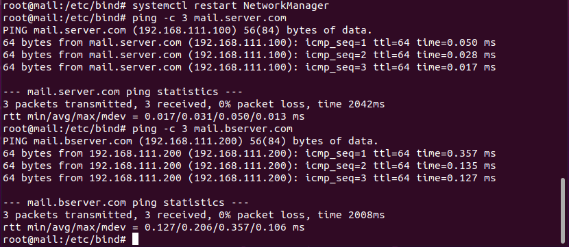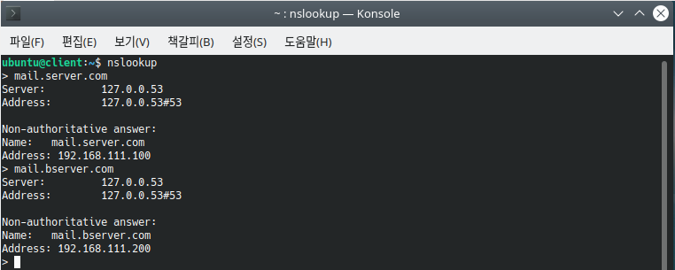 nslookup 명령을 입력하고 mail.server.com(192.168.111.100)과 mail.bserver.com(192.168.111.200)의 IP주소가 정확히 나오는지 확인한다.